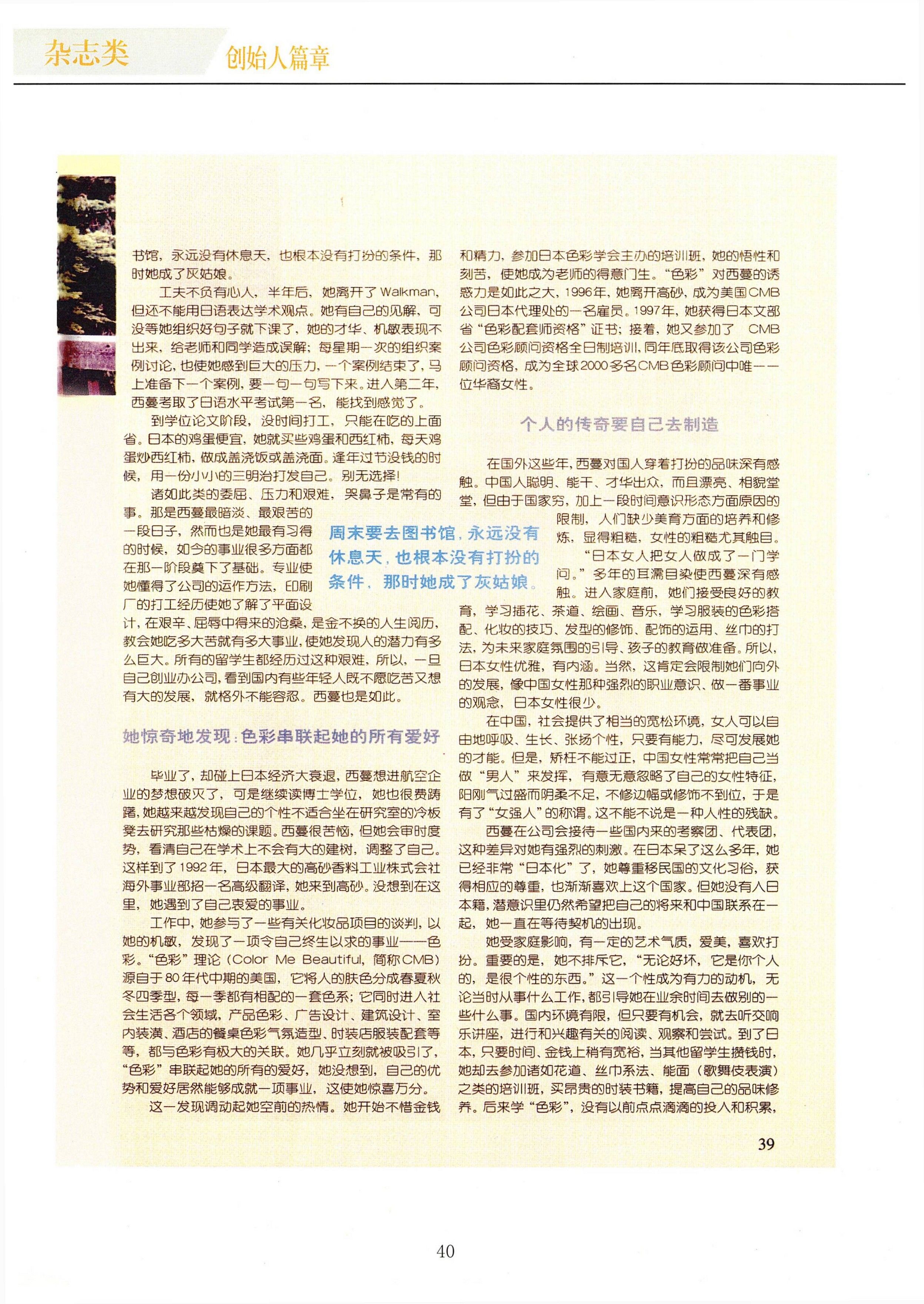 這一發現調動起她空前的熱情。她開始不惜金錢和精力,參加日本色彩學會主辦的培訓班,她的悟性和刻苦,使她成為老師的得意門生。“色彩”對西蔓的誘惑力是如此之大,1996年,她離開高砂,成為美國CMB公司日本代理處的一名雇員。1997年,她獲得日本文部省“色彩配套師資格”證書;接著,她又參加了CMB公司色彩顧問資格全日制培訓,同年底取得該公司色彩顧問資格,成為全球2000多名CMB色彩顧問中唯一一位華裔女性。