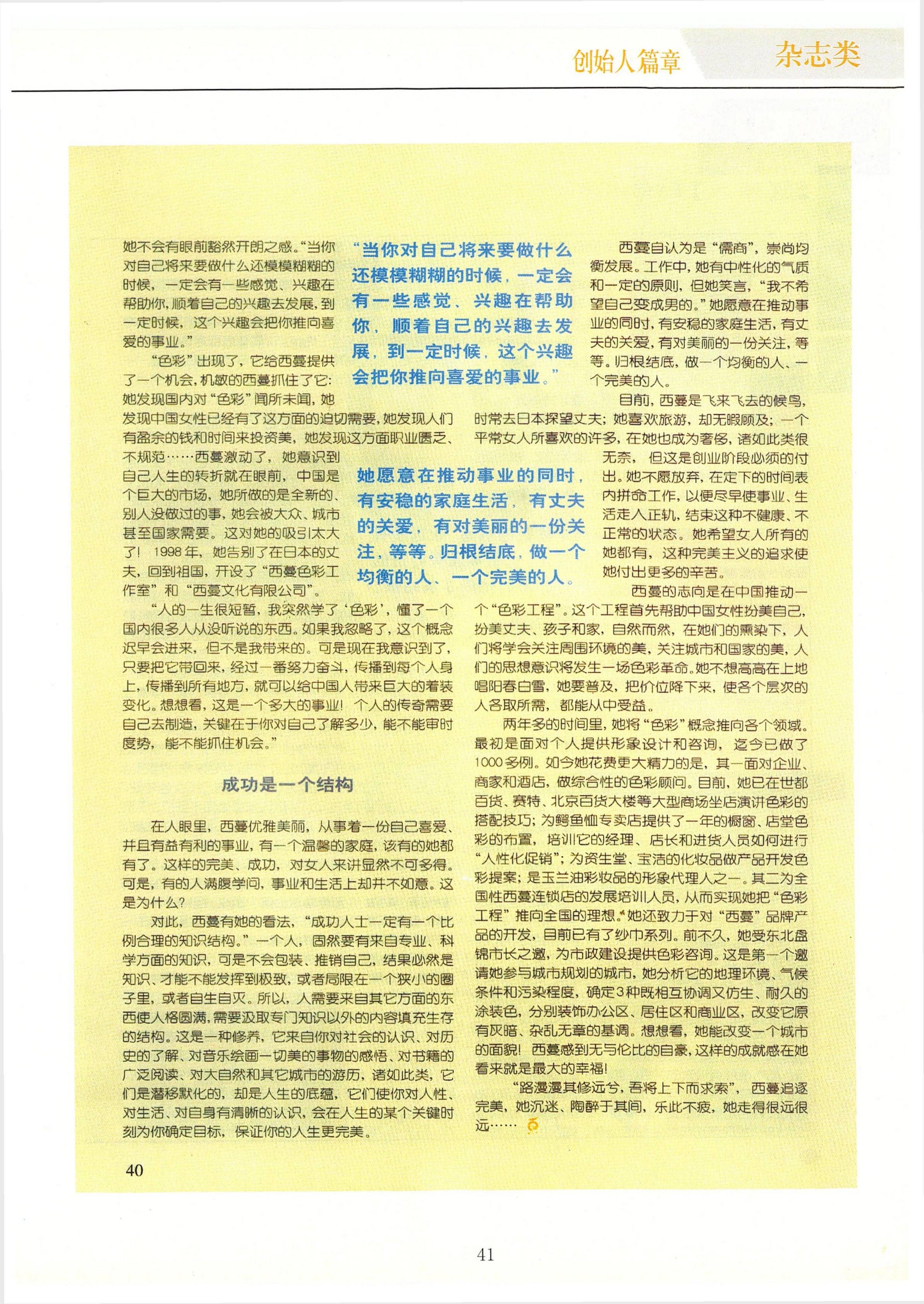 “人的一生很短暫,我突然學了‘色彩’,懂了一個國內很多人從沒聽說的東西。如果我忽略了,這個概念遲早會進來,但不是我帶來的。可是現在我意識到了,只要把它帶回來,經過一番努力奮斗,傳播到每個人身上,傳播到所有地方,就可以給中國人帶來巨大的著裝變化。想想看,這是一個多大的事業!個人的傳奇需要自己去制造,關鍵在于你對自己了解多少,能不能審時度勢,能不能抓住機會。”