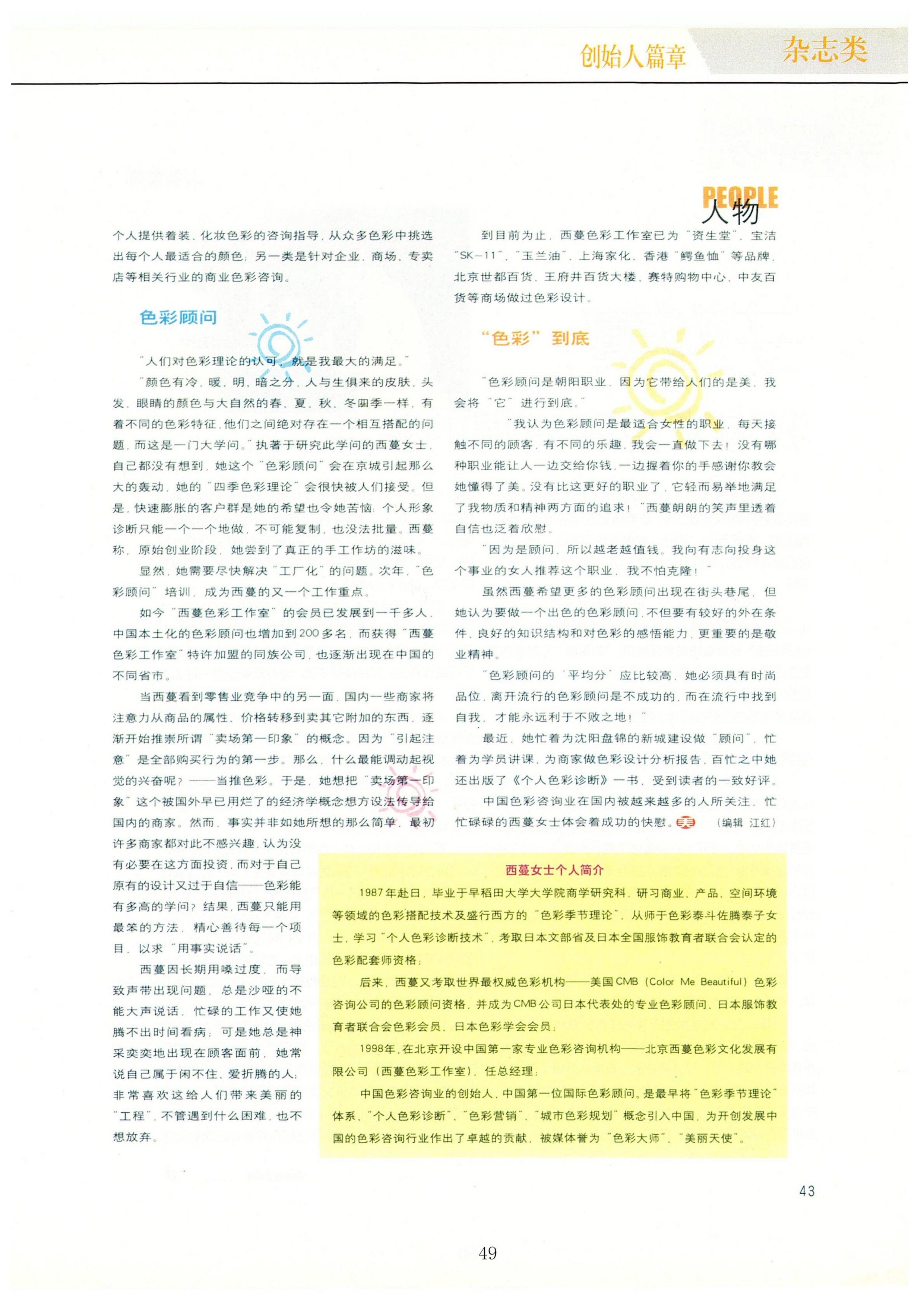 中國(guó)色彩咨詢業(yè)在國(guó)內(nèi)被越來越多的人所關(guān)注,忙忙碌碌的西蔓女士體會(huì)著成功的快慰。(編輯 江紅)