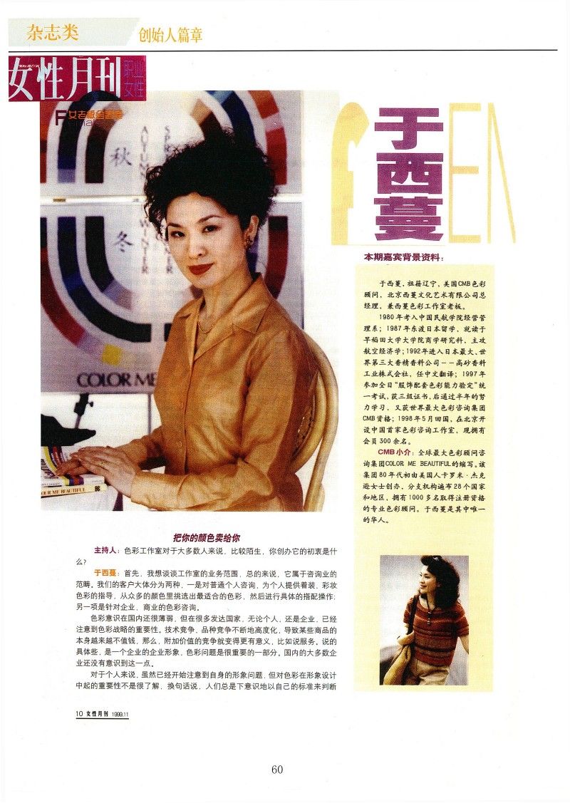 CMB小介:全球最大色彩顧問咨詢集團COLOR ME BEAUTIFUL的縮寫。該集團80年代初由美國人卡羅米·杰克遜女士創辦,分支機構遍布28個國家和地區,擁有1000多名取得注冊資格的專業色彩顧問。于西蔓是其中唯一的華人。
