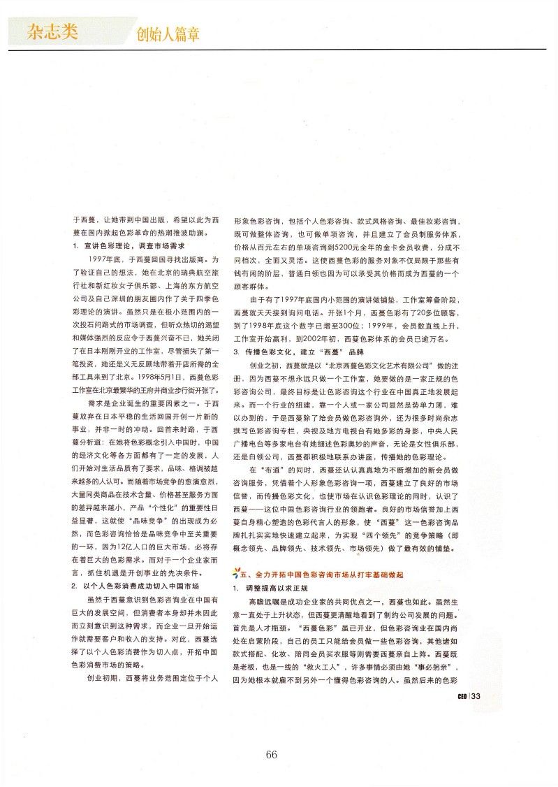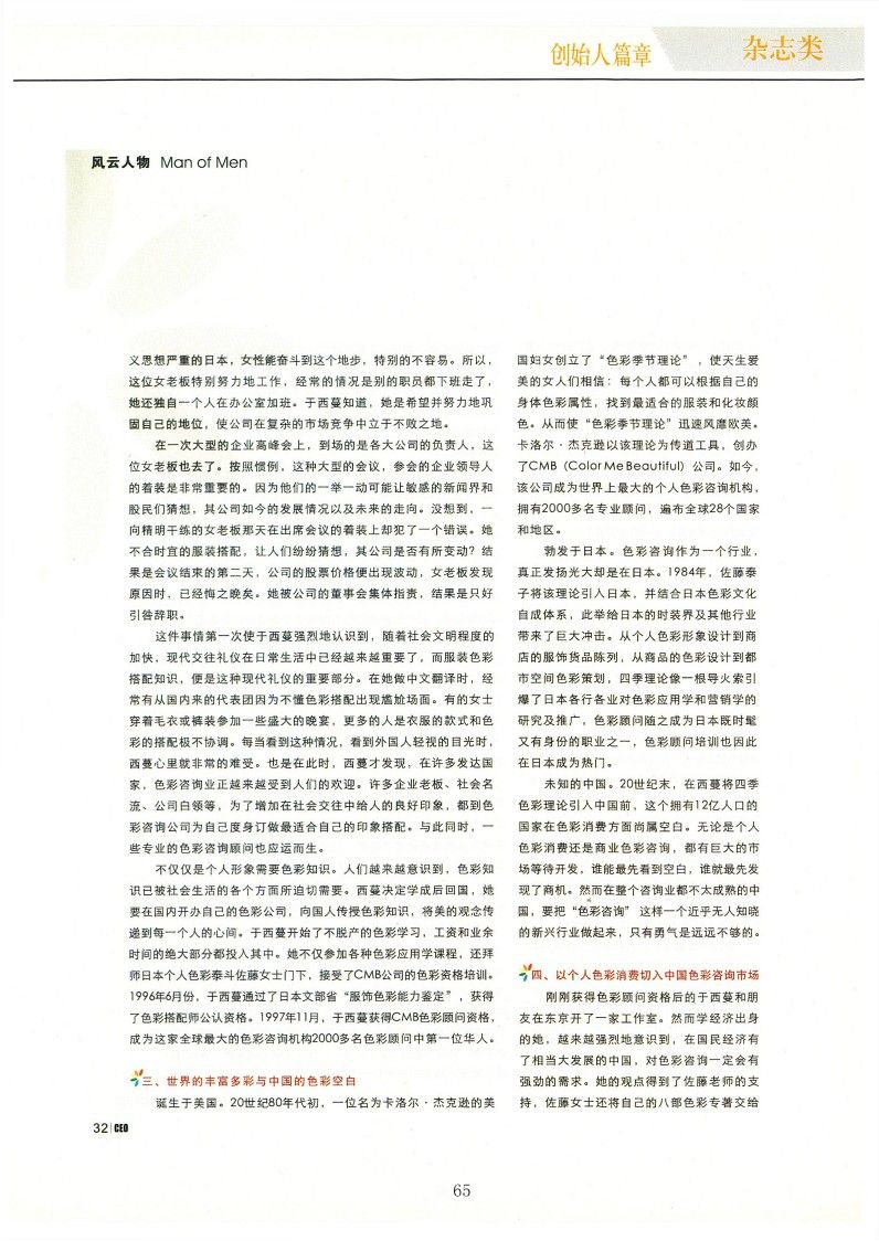 創業之初,西蔓就是以“北京西蔓色彩文化藝術有限公司”做的注冊,因為西蔓不想永遠只做一個工作室,她要做的是一家正規的色彩咨詢公司,最終目標是讓色彩咨詢這個行業在中國真正地發展起來。而一個行業的組建,靠一個人或一家公司顯然是勢單力薄,難以辦到的,于是西蔓除了給會員做色彩咨詢外,還為很多時尚雜志撰寫色彩咨詢專欄,央視及地方電視臺有她多彩的身影,中央人民廣播電臺等多家電臺有她細述色彩奧妙的聲音,無論是女性俱樂部,還是白領公司,西蔓都積極地聯系辦講座,傳播她的色彩理論。