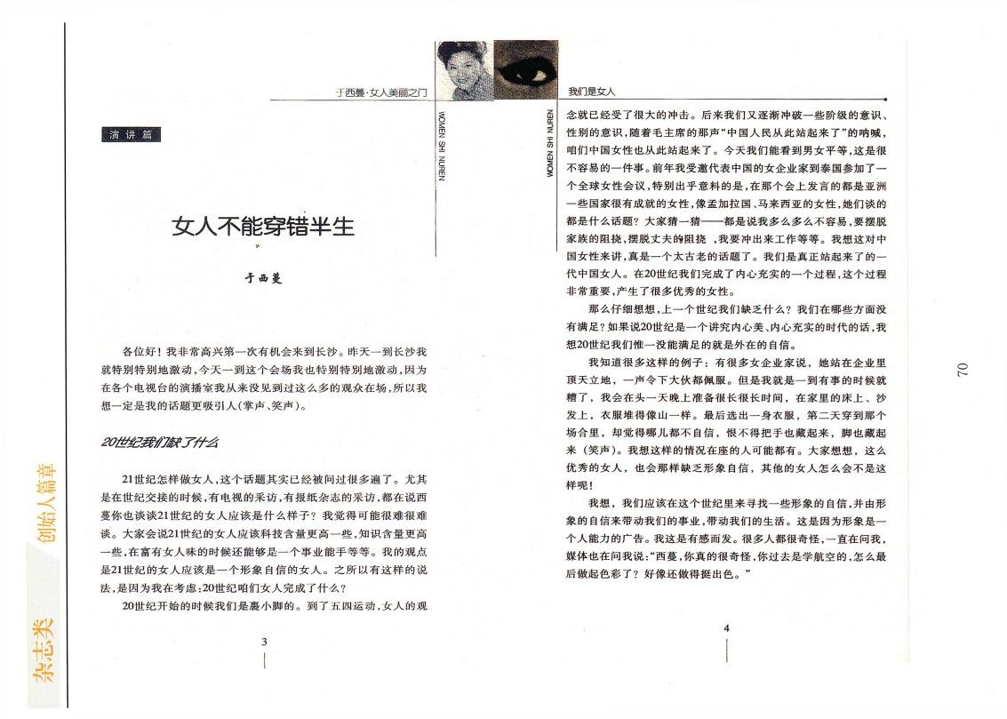 21世紀怎樣做女人,這個話題其實已經被問過很多遍了。尤其是在世紀交接的時候,有電視的采訪,有報紙雜志的采訪,都在說西蔓你也談談21世紀的女人應該是什么樣子?我覺得可能很難很難談。大家會說21世紀的女人應該科技含量更高一些,知識含量更高一些,在富有女人味的時候還能夠是一個事業能手等等。我的觀點是21世紀的女人應該是一個形象自信的女人。之所以有這樣的說法,是因為我在考慮:20世紀咱們女人完成了什么?