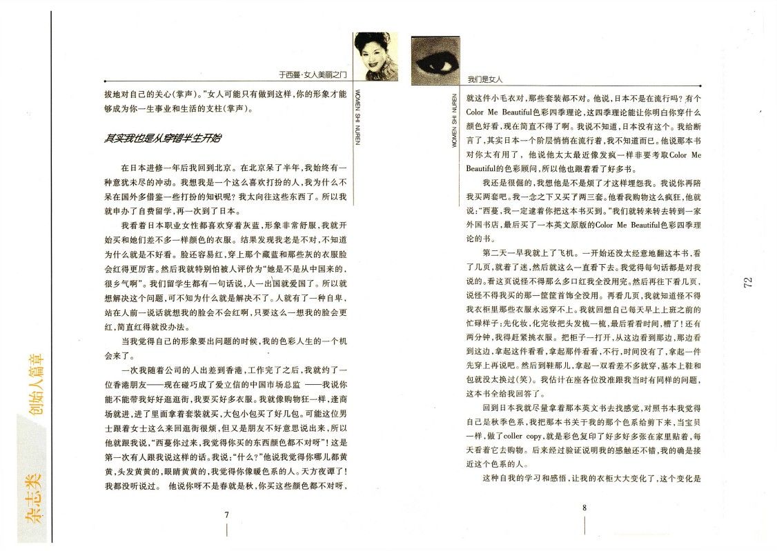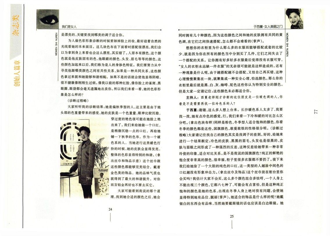 一次我隨著公司的人出差到香港,工作完了之后,我就約了一位香港朋友——現在碰巧成了愛立信的中國市場總監——我說你能不能帶我好好逛逛街,我要買好多衣服。我就像購物狂一樣,逢商場就進,進了里面拿著套裝就買,大包小包買了好幾包。可能這位男士跟著女士這么來回逛街很煩,但又是朋友不好意思說出來,所以他就跟我說,“西蔓你過來,我覺得你買的東西顏色都不對呀”!這是第一次有人跟我說這樣的話。我說:“什么?”他說我覺得你哪兒都黃黃,頭發黃黃的,眼睛黃黃的,我覺得你像暖色系的人。天方夜譚了!我都沒聽說過。他說你呀不是春就是秋,你買這些顏色都不對呀,就這件小毛衣對,那些套裝都不對。他說,日本不是在流行嗎?有個Color Me Beautiful色彩四季理論,這四季理論能讓你明白你穿什么顏色好看,現在簡直不得了啊。我說不知道,日本沒有這個。我給斷言了,其實日本一個階層悄悄在流行著,我不知道而已。他說那本書對你太有用了,他說他太太最近像發瘋一樣非要考取Color Me Beautiful的色彩顧問,所以他也跟著看了好多書。
