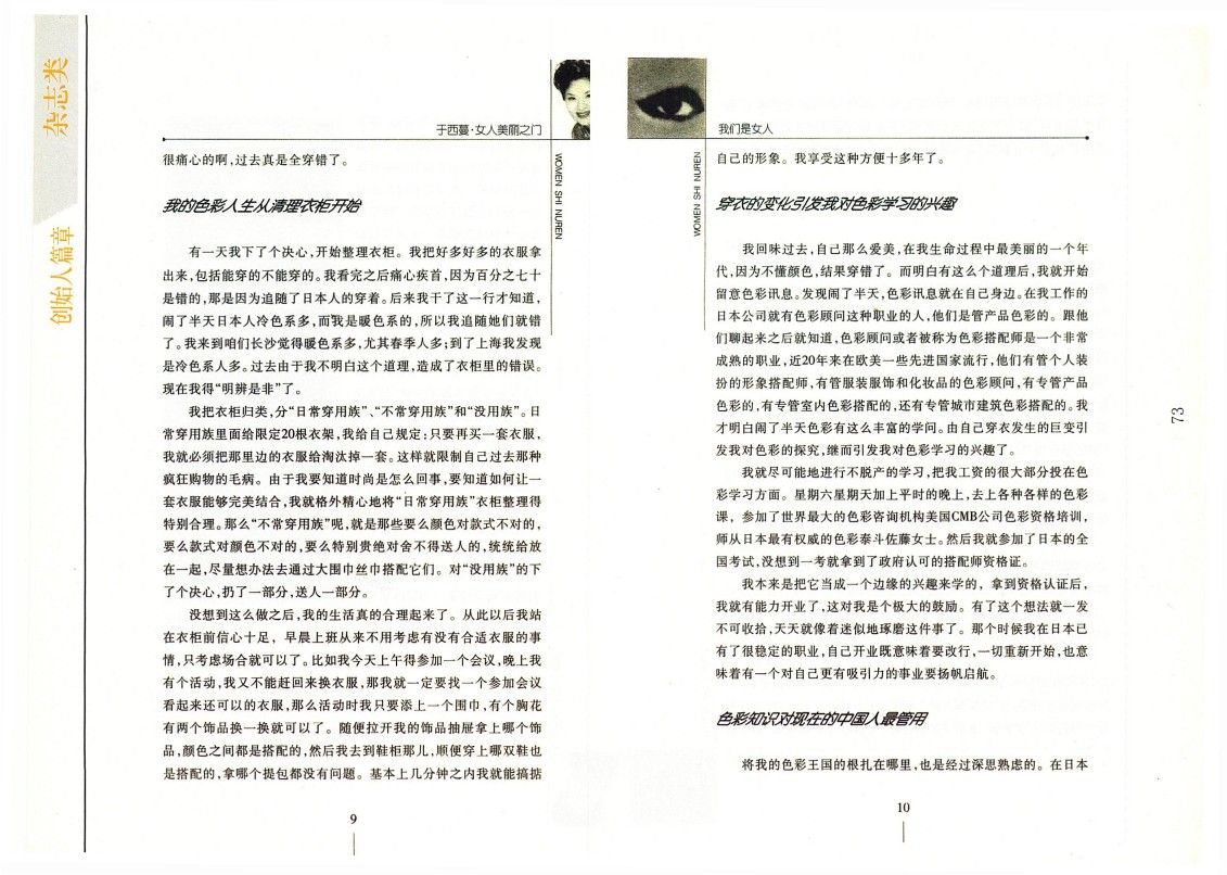 回到日本我就盡量拿著那本英文書去找感覺,對照書本我覺得自己是秋季色系,我把那本書關于我的那個色系給剪下來,當寶貝一樣,做了coller copy,就是彩色復印了好多好多張在家里貼著,每天看著它去購物。后來經過驗證說明我的感觸還不錯,我的確是接近這個色系的人。