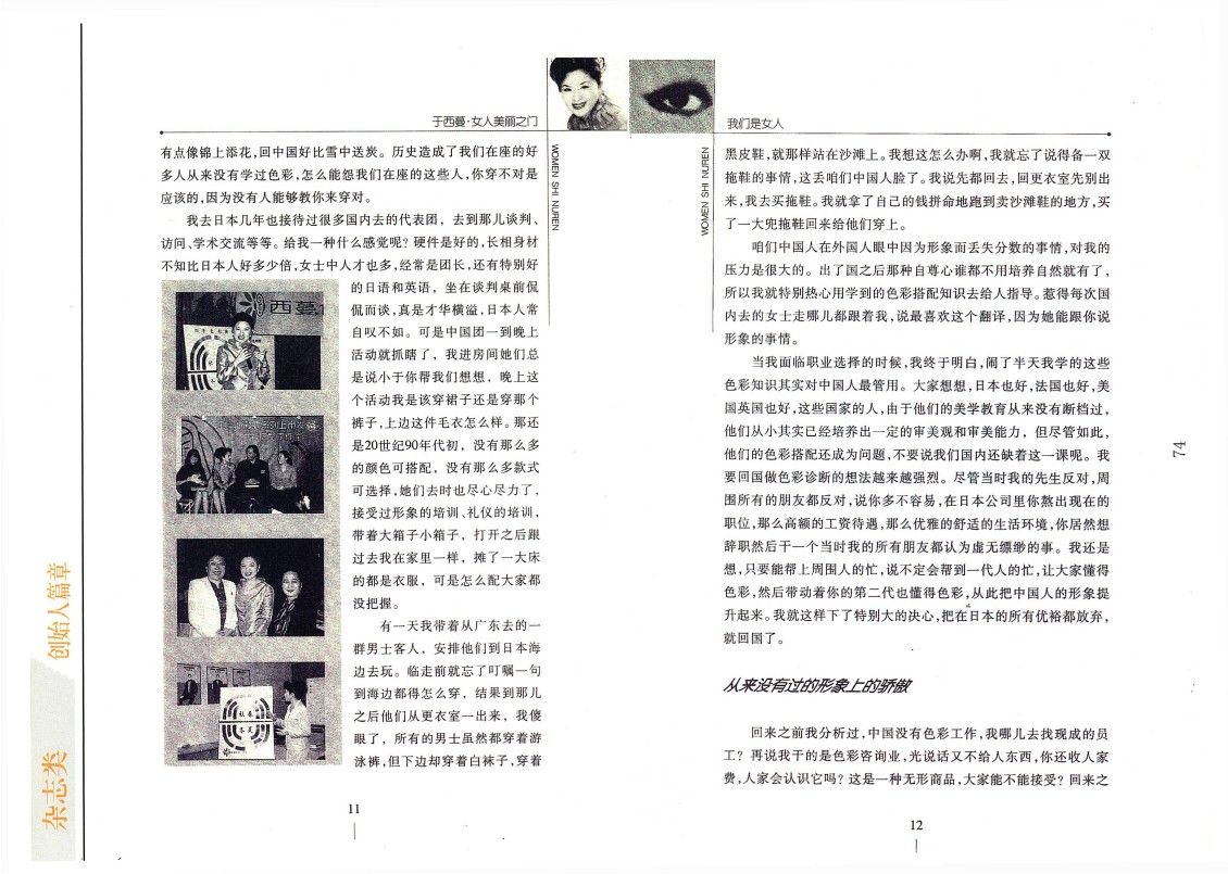 我去日本幾年也接待過很多國內去的代表團,去到那兒談判、訪問、學術交流等等。給我一種什么感覺呢?硬件是好的,長相身材不知比日本人好多少倍,女士中人才也多,經常是團長,還有特別好的日語和英語,坐在談判桌前侃侃而談,真是才華橫溢,日本人常自嘆不如。可是中國團一到晚上活動就抓瞎了,我進房間她們總是說小于你幫我們想想,晚上這個活動我是該穿裙子還是穿那個褲子,上邊這件毛衣怎么樣。那還是20世紀90年代初,沒有那么多的顏色可搭配,沒有那么多款式可選擇,她們去時也盡心盡力了,接受過形象的培訓、禮儀的培訓,帶著大箱子小箱子,打開之后跟過去我在家里一樣,攤了一大床的都是衣服,可是怎么配大家都沒把握。