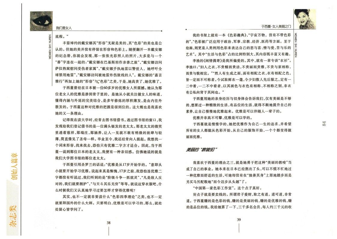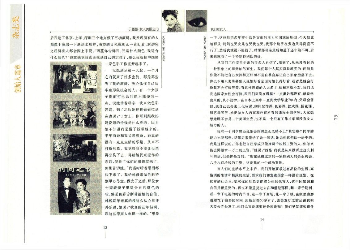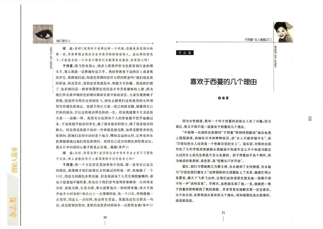 “中國第一位國際色彩顧問”于西蔓“特別特別激動”地在電視上侃侃而談,談她在日本的種種經歷,談“女人不能穿錯半生”,談“21世紀的女人應該是一個形象自信的女人”。說實話,對那些在國外吃了幾年洋飯回來就搖頭晃腦說不知道車怎么開不知道馬路怎么過的女士或先生我是不怎么在意的,但于西蔓似乎是個例外,因為她說的是美麗,是色彩,是“優雅從17歲開始”。