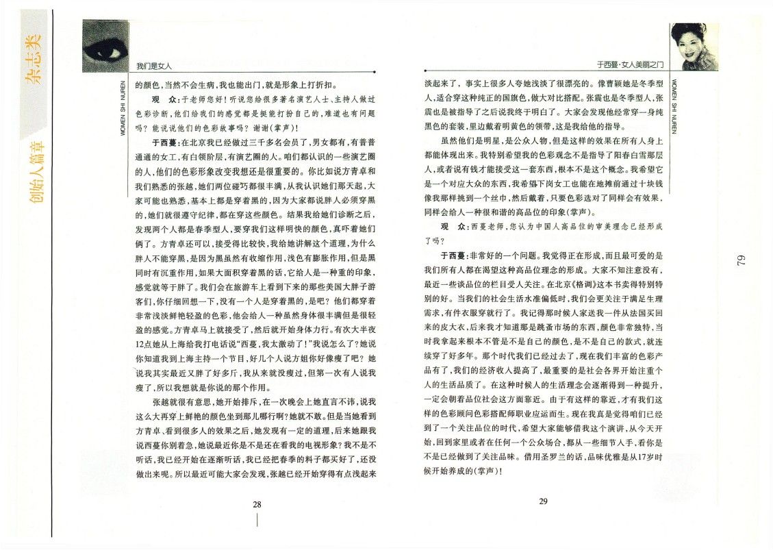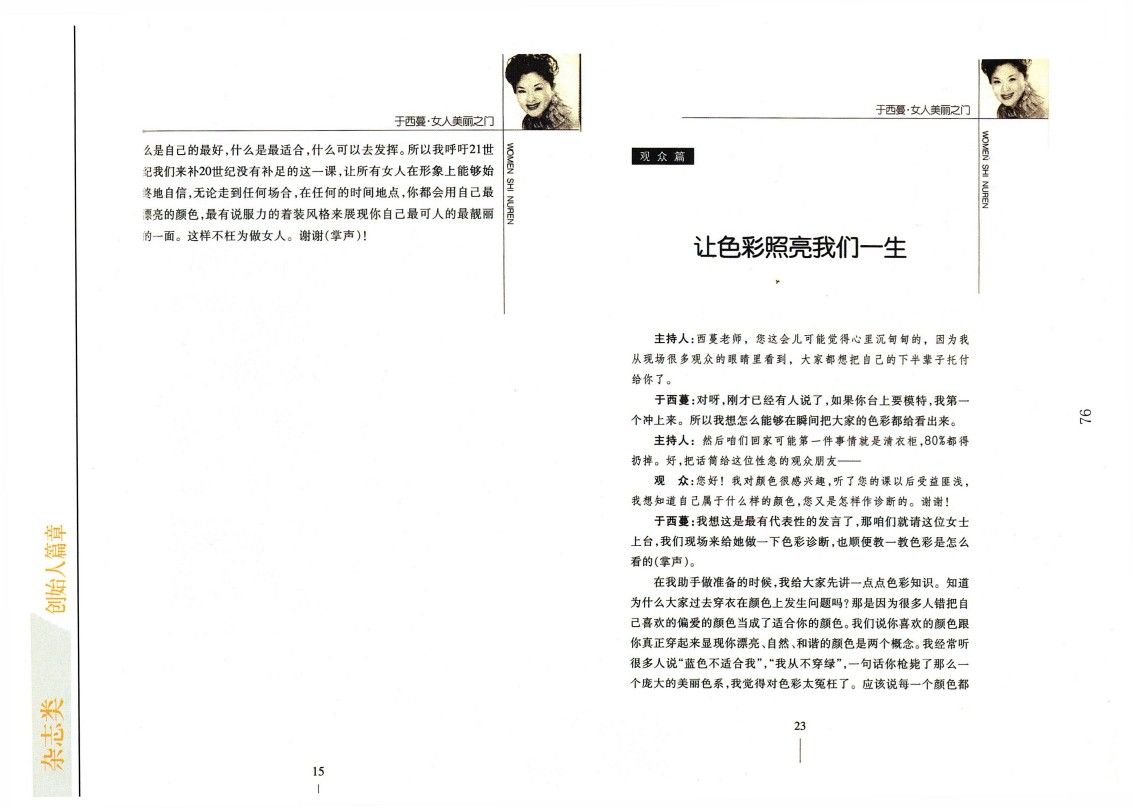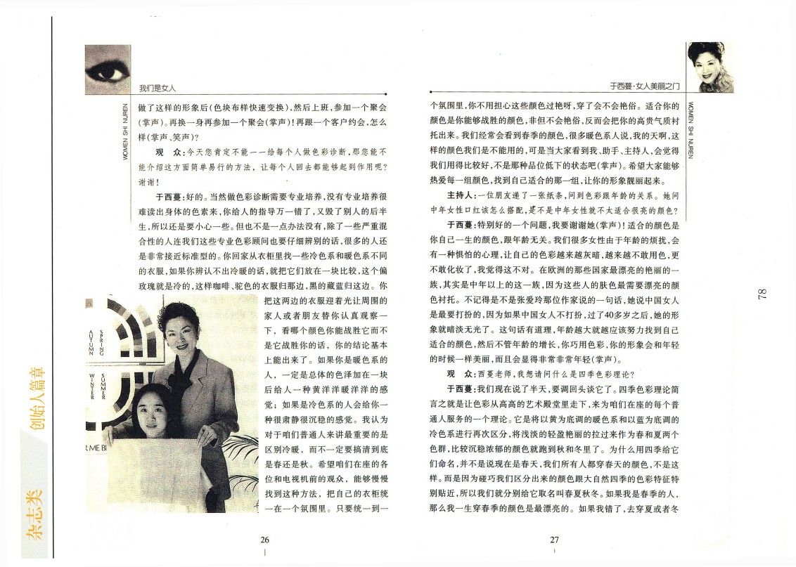 雖然他們是明星,是公眾人物,但是這樣的效果在所有人身上都能體現出來。我特別希望我的色彩觀念不是指導了陽春白雪那層人,或者說有錢才能接受這一套東西,根本不是這個概念。我希望它是一個對應大眾的東西,我希望下崗女工也能在地攤前通過十塊錢像我那樣挑到一個絲巾,然后戴著,只要色彩選對了同樣會有效果,同樣會給人一種很和諧的高品位的印象(掌聲)。
