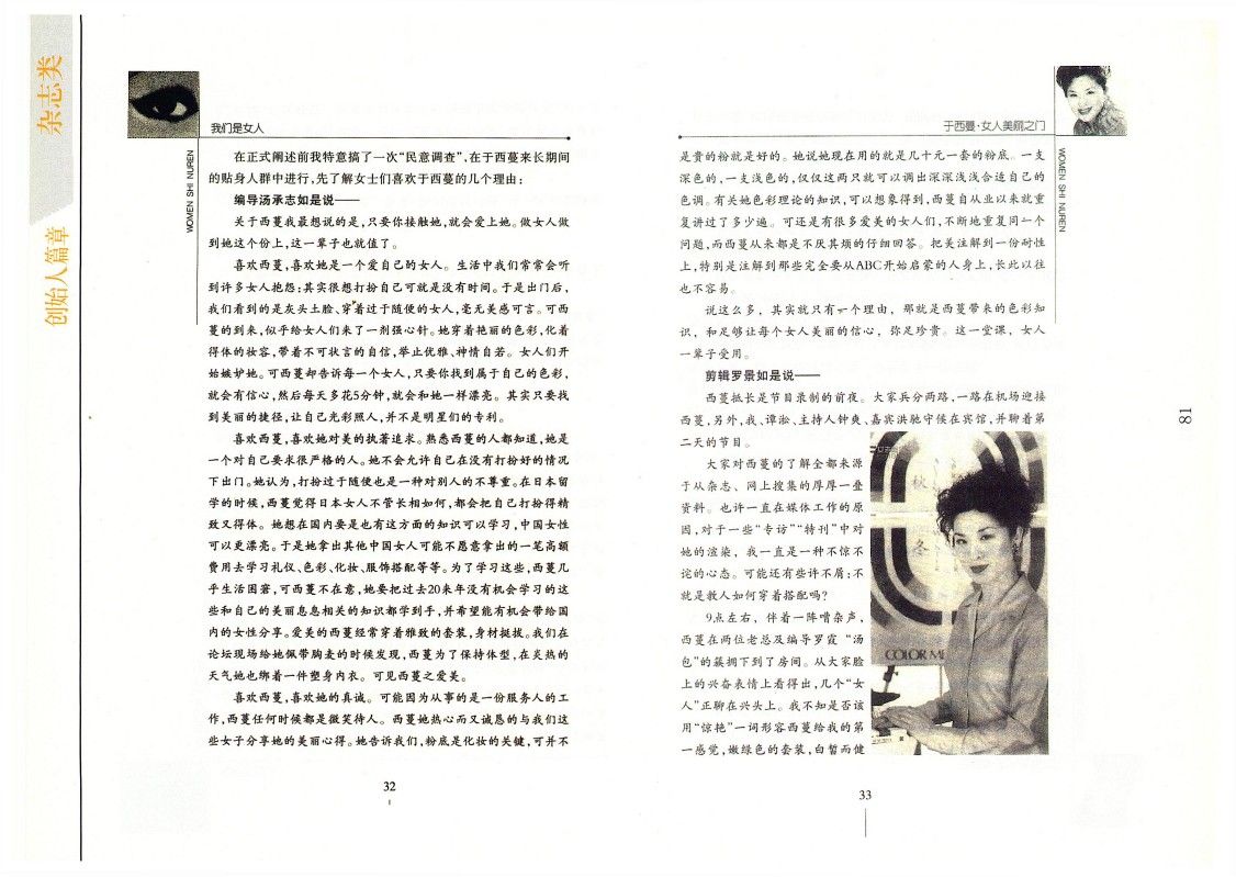 霍紅,我們習慣地稱之為霍大俠,自從她到了女性頻道,自從她與“21世紀我們做女人”這樣國際的大話題扯上了關系,她就忙得云里霧里,滿天下飛來飛去的,讓我們這些老朋友想見她一面都不得不嘆一聲“談何容易”。早兩天,忽然就見到了她,一見,她就把一堆于西蔓的資料推到了我的面前,并非常肯定地斷言我一定會喜歡。且不由分說,還要我說出喜歡的幾個理由。我知道推脫是比較難的,說說就說說。