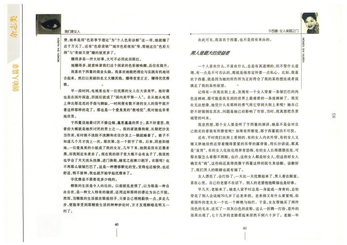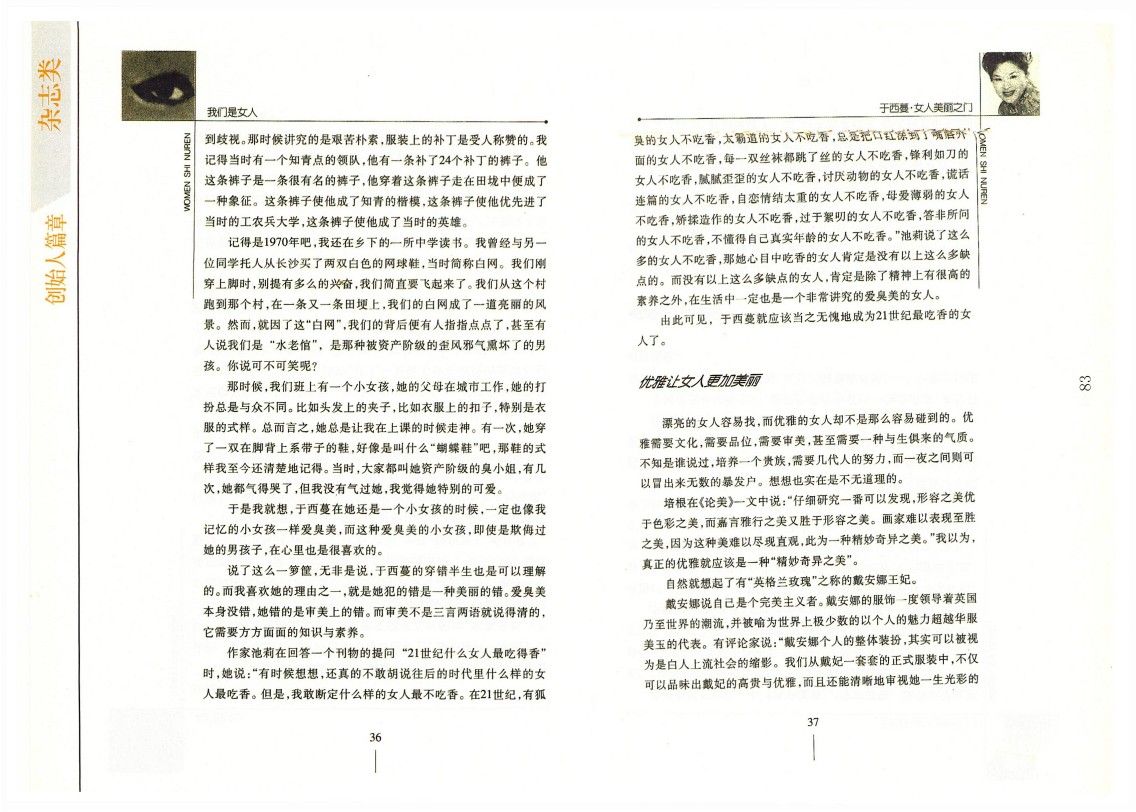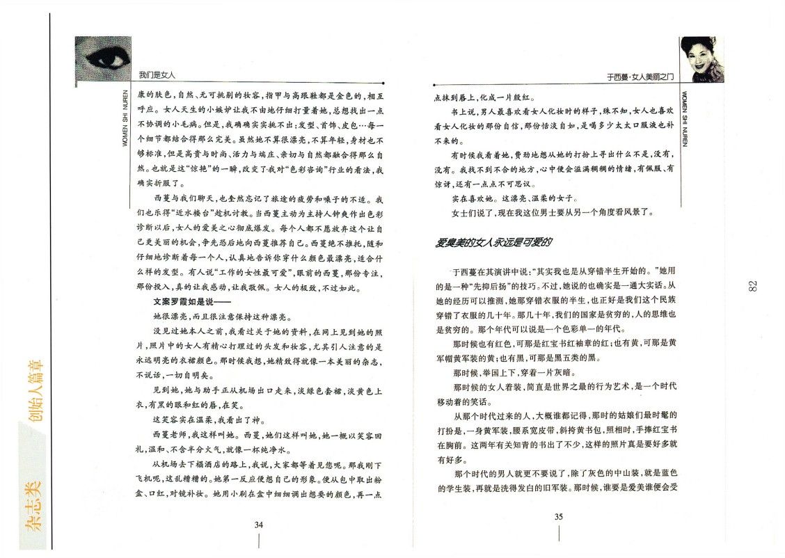 還有,平時我們在街上看到的,有的女人內衣外穿,有的女人又矮又胖她居然還穿著繃得緊緊的吊帶的露背裝,用長沙話說,那真是“顯背”。有的女人化妝化得異常恐怖,有的女人長得漂漂亮亮,可那衣服怎么看都不順眼。也許,這些女人都是好女人,但這些好女人確實有“病”,這些病還真得找像于西蔓這樣的醫生來診斷。診斷好了,我們男人的眼睛也就有福了。