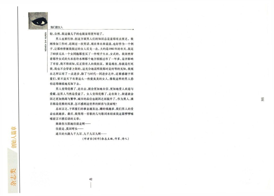 男人也要打扮,但這方面男人們的知識總是顯得有點貧乏。我剛參加工作時,還鬧過一次笑話,現在拿出來說說,也好作為一個例子,讓那些曾被我損過的女人反戈一擊。大約是1981年的冬天,我花了60多元從一個女同胞那里買了一件呢子大衣,女式的。我居然穿著那件女式的大衣在冷水灘那個地方招搖過市了一年多。是否影響了市容,我不得而知,反正沒有人向我抗議。要是現在,你就是打死我,我也不會穿著上街的。這充分地說明我那時是何等的無知。我現在之所以有了一點進步,除了與時代一同進步之外,還要感謝于西蔓們,要不是天下有著這么一些愛臭美的女人,像我這樣的男人恐怕還得繼續地無知下去。