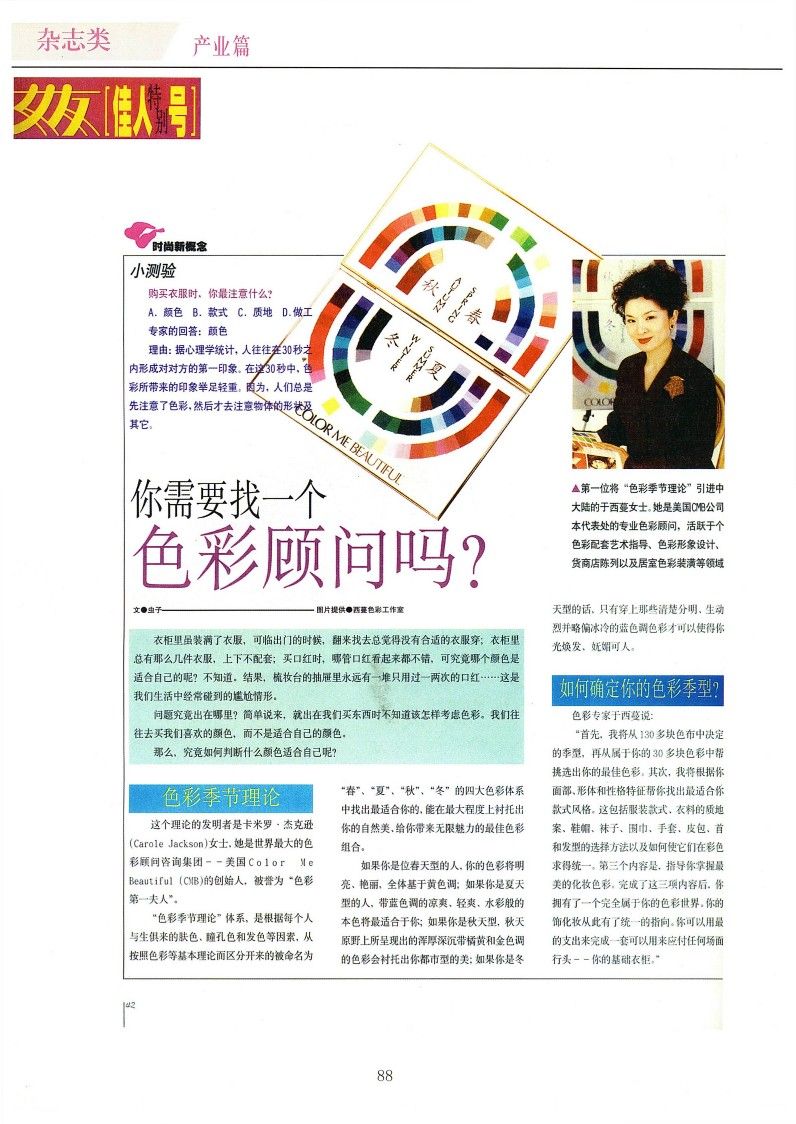 “首先,我將從130多塊色布中決定你的季型,再從屬于你的30多塊色彩中幫你挑選出你的最佳色彩。其次,我將根據你的面部、形體和性格特征幫你找出最適合你的款式風格。這包括服裝款式、衣料的質地方案、鞋帽、襪子、圍巾、手套、皮包、首飾和發型的選擇方法以及如何使它們在彩色中求得統一。第三個內容是,指導你掌握最完美的化妝色彩。完成了這三項內容后,你就擁有了一個完全屬于你的色彩世界。你的首飾化妝從此有了統一的指向。你可以用最少的支出來完成一套可以用來應付任何場面的行頭——你的基礎衣柜。”