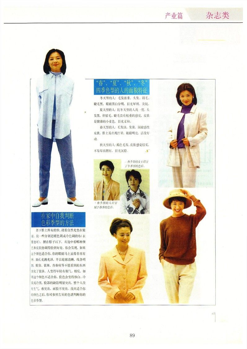 如果你是位春天型的人,你的色彩將明亮、艷麗,全體基于黃色調;如果你是夏天型的人,帶藍色調的涼爽、輕爽、水彩般的本色將最適合于你;如果你是秋天型,秋天原野上所呈現出的渾厚深沉帶橘黃和金色調的色彩會襯托出你都市型的美;如果你是冬天型的話,只有穿上那些清楚分明、生動■烈并略偏冰冷的藍色調色彩才可以使得你容光煥發、嫵媚可人。