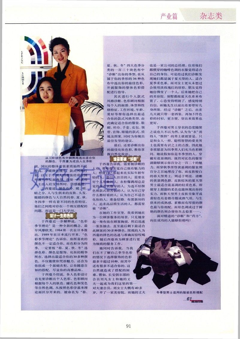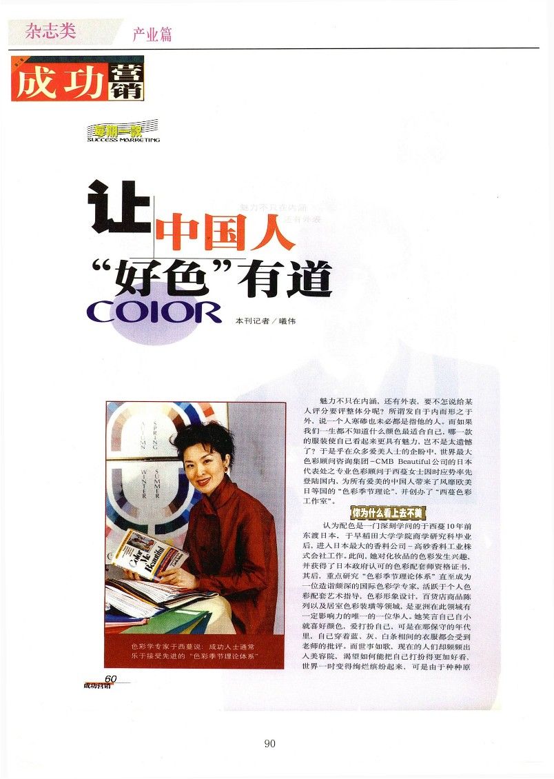 認(rèn)為配色是一門深刻學(xué)問的于西蔓10年前東渡日本,于早稻田大學(xué)學(xué)院商學(xué)研究科畢業(yè)后,進(jìn)入日本最大的香料公司-高砂香料工業(yè)株式會社工作。此間,她對化妝品的色彩發(fā)生興趣,并獲得了日本政府認(rèn)可的色彩配套師資格證書,其后,重點研究“色彩季節(jié)理論體系”直至成為一位造詣頗深的國際色彩學(xué)專家,活躍于個人色彩配套藝術(shù)指導(dǎo),色彩形象設(shè)計,百貨店商品陳列以及居室色彩裝潢等領(lǐng)域,是亞洲在此領(lǐng)域有一定影響力的唯一的一位華人。她笑言自己自小就喜好顏色,愛打扮自己,可是在那保守的年代里,自己穿著藍(lán)、灰、白條相間的衣服都會受到老師的批評。而世事如歌,現(xiàn)在的人們卻頻頻出入美容院,渴望如何能把自己打扮得更加好看,世界一時變得絢爛繽紛起來,可是由于種種原因,國民的整體著裝素質(zhì)始終不是很高,冷暖顏色撞車,款式風(fēng)格打架,以至于中國人的著裝經(jīng)常在國外被當(dāng)作反面典型,常使一些成功人士出入社交場所時,倍感尷尬。