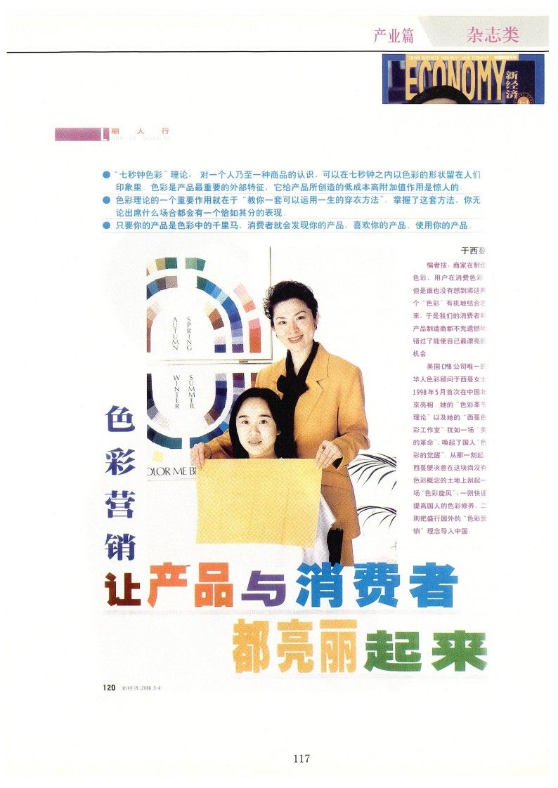 美國CMB公司唯一的華人色彩顧問于西蔓女士1998年5月首次在中國北京亮相。她的“色彩季節理論”以及她的“西蔓色彩工作室”猶如一場“美的革命”,喚起了國人“色彩的覺醒”。從那一刻起,西蔓便決意在這塊尚沒有色彩概念的土地上刮起一場“色彩旋風”:一則快速提高國人的色彩修養;二則把盛行國外的“色彩營銷”理念導入中國。
