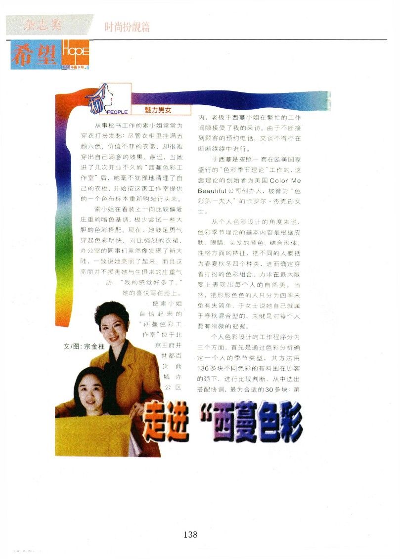 于西蔓把她的色彩設計工作稱為“色彩診斷”,對每個初次上門的顧客,首先要詳細詢問平時的著裝喜好,并要求把穿著不同服裝的照片拿給她看,然后一一指出在色彩搭配上合適和不合適的地方。她的總體感覺是:顧客中除了少數悟性極佳的之外,大部分人在色彩選擇上存在著程度不同的誤區。這些顧客自己也承認,她們的許多服裝幾乎從一買來就壓了箱底,造成很大的浪費,經過于西蔓的“診治”之后,她們覺得逛商場買衣服已經變得非常簡單,只需按自己的色彩范圍去選擇就夠了。