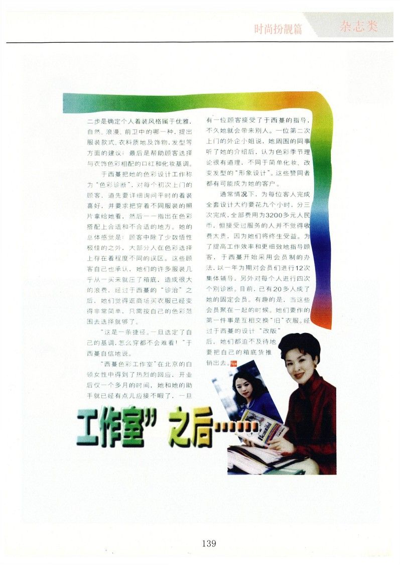 使索小姐自信起來的“西蔓色彩工作室”位于北京王府井世都百貨商城辦公區內,老板于西蔓小姐在繁忙的工作間隙接受了我的采訪。由于不斷接到顧客的預約電話,交談不得不在斷續續中進行。