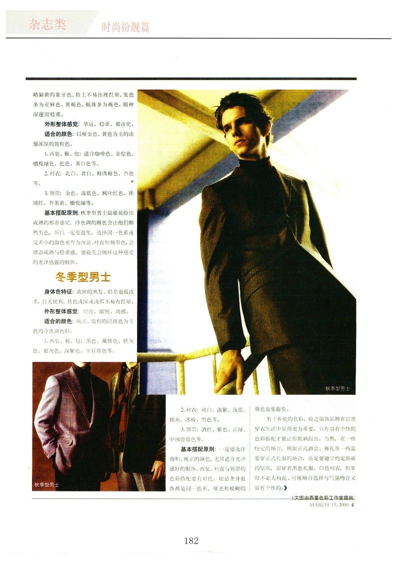 大自然在不同季節(jié)呈現(xiàn)出不同的色彩魅力,“春”的五彩斑斕,“夏”的海天一色,“秋”的濃郁渾厚,“冬”的潔凈純正。不同的人也如不同的季節(jié),每個人與生俱來的膚色、發(fā)色、瞳孔色和唇色等,決定了各自服裝色彩的范圍。這個范圍就是屬于你的色彩季節(jié)。在你的“季節(jié)”里,信手拈來的任何一個顏色都可以簡單、快捷地塑造出得體的形象,為追求簡單生活卻要求高成功率的男士提供了一條獨特而方便的穿衣之道。