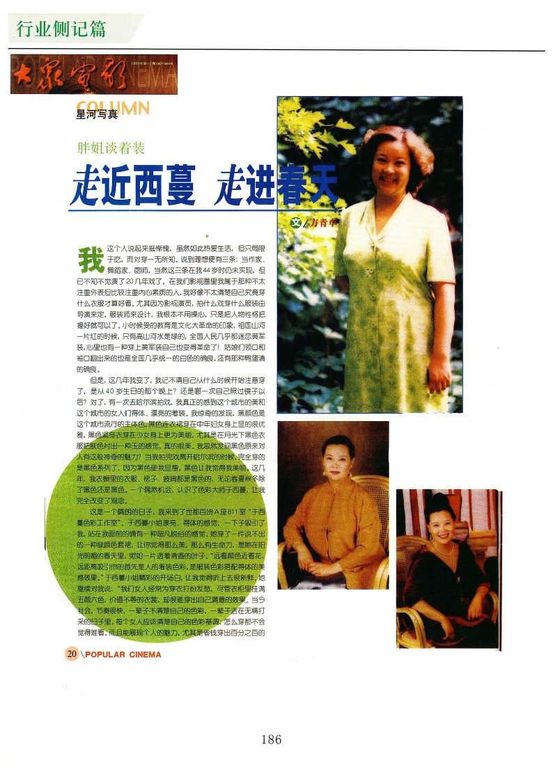 但是,這幾年我變了,我記不清自己從什么時候開始注意穿了,是從40歲生日的那個晚上?還是哪一次自己照過鏡子以后?對了,有一次去哈爾濱拍戲,我真正的感到這個城市的美和這個城市的女人們得體、漂亮的著裝。我驚奇的發現,黑顏色是這個城市流行的主體色,黑色連衣裙穿在中年婦女身上顯的很優雅,黑色緊身衣穿在少女身上更為美麗,尤其是在月光下黑色衣服把膚色襯出一種玉的感覺,真的很美。我忽然發現黑色原來對人有這般神奇的魅力?當我拍完戲離開哈爾濱的時候,完全穿的是黑色系列了,因為黑色使我顯瘦,黑色讓我覺得我美麗。這幾年,我衣櫥里的衣服、裙子、披肩都是黑色的,無論春夏秋冬除了黑色還是黑色。一個偶然機會,認識了色彩大師于西蔓,讓我完全改變了觀念。