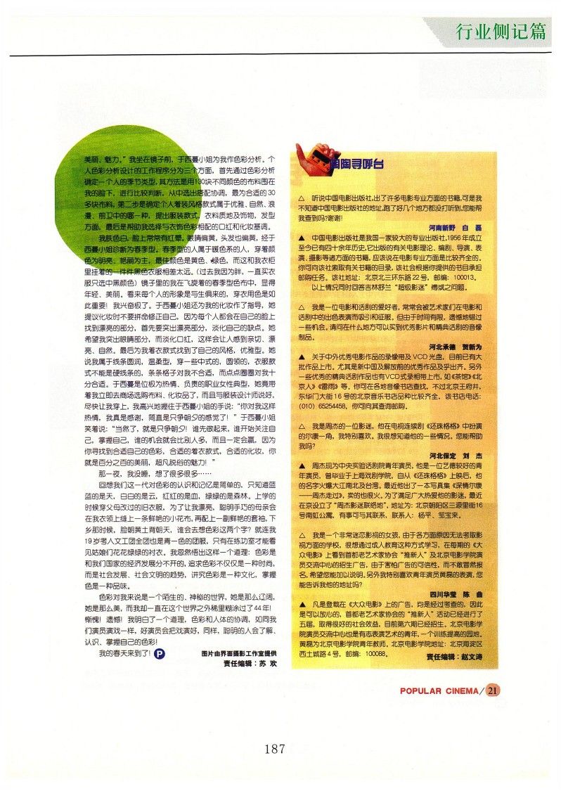 色彩對我來說是一個陌生的、神秘的世界,她是那么遼闊,她是那么美,而我卻一直在這個世界之外稀里糊涂過了44年!慚愧!遺憾!我明白了一個道理,色彩和人體的協調,如同我們演員演戲一樣,好演員會把戲演好,同樣,聰明的人會了解、認識、掌握自己的色彩!