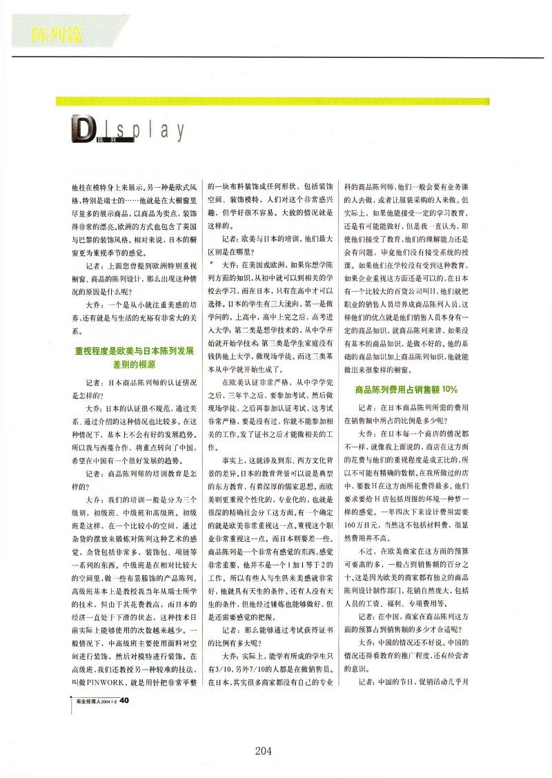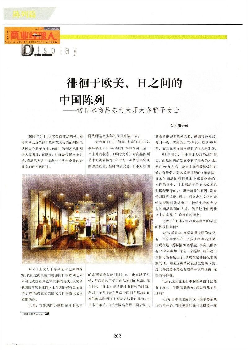 2003年5月,記者曾就商品陳列、櫥窗陳列以及色彩在陳列藝術(shù)方面的問(wèn)題采訪過(guò)大喬雅子女士。彼時(shí),陳列藝術(shù)剛剛涉入零售業(yè),而現(xiàn)在,也就是僅僅八個(gè)月后,商品陳列這一概念對(duì)于零售企業(yè)的企業(yè)家們已不再陌生。
