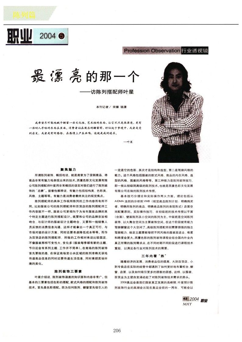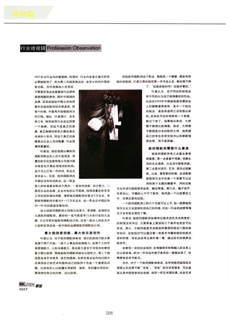 葉星認為。對于陳列搭配師來說,他們的挑戰可能主要來源于兩個方面。一是個人事業的拓展能力。如果個人的市場營銷能力。人際溝通能力、表達能力甚至于對項目的掌控能力都比較弱,那做起陳列搭配師就會比較吃力。第二個挑戰是自身藝術修養、技藝的提高。怎樣在商業運作的過程中還保持自己的藝術風格和自己的陳列個性是一個重要的問題。比如有的人比較擅長用面料、道具,有的擅長用花材,要保持住自己的風格,這比較難但做陳列搭配師這個職業,每做完一個櫥窗,都會有很強的成就感。葉星記得在做完第一件作品之后,激動得不得了:“這是我做的嗎?還挺好看的?!?/p>