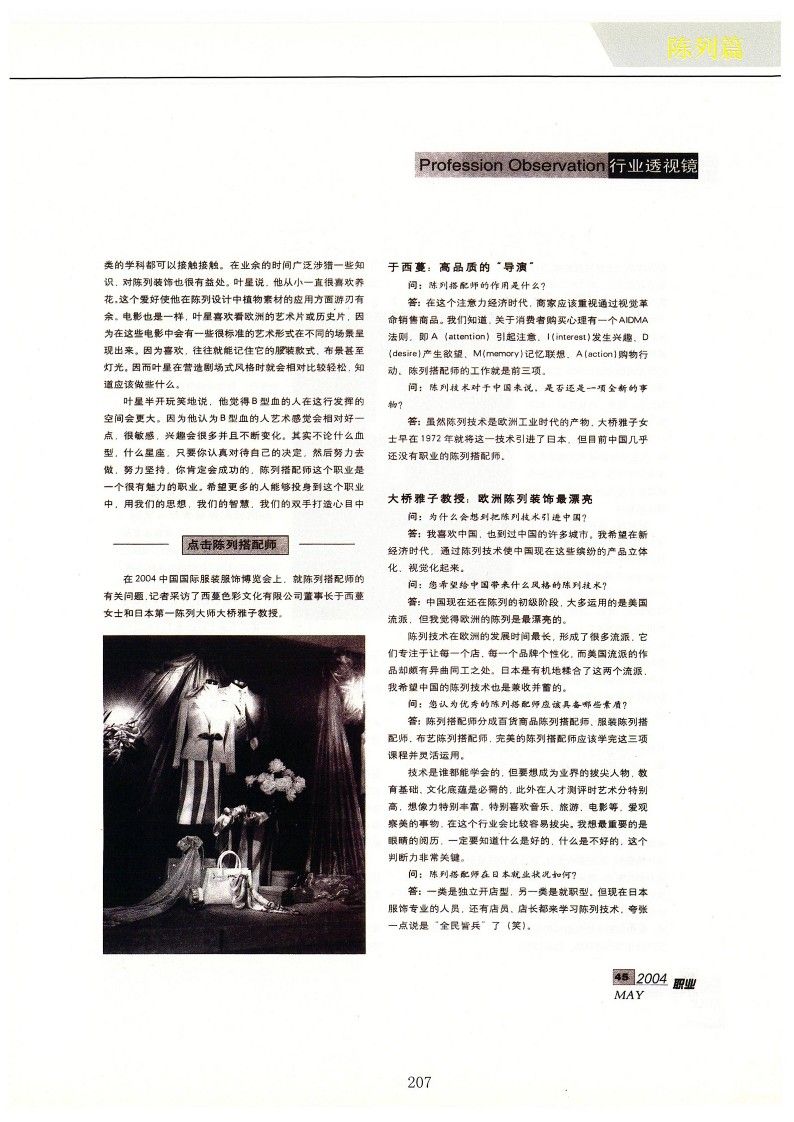 答:雖然陳列技術是歐洲工業時代的產物,大橋雅子女士早在1972年就將這一技術引進了日本,但目前中國幾乎還沒有職業的陳列搭配師。