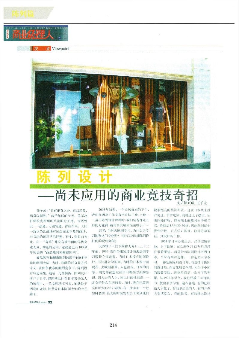 1964年日本辦奧運會,經濟高速增長,上了軌道,在歐洲學習12年后我沒有帶著服裝,而是帶著陳列設計回到日本。當時有兩種選擇,一種是去大學教書,一種是做陳列設計師,我選擇了做陳列設計師。在文化服裝學院,相當于中國的服裝學院,進到里面第一次開了陳列課。從1972年至今,我已經教了30年的書,教出很多學生,遍布各地,有的已經很大歲數了。有很多出名的人,有的開辦大型博覽會,有的教書,有的進入設計室,為各種大型百貨公司、展示會、博覽會做設計。在日本,他們被稱為DECORAOR裝飾家,是以自由職業者出現的,(FREE)與各種百貨店、零售業簽約。最近日本泡沫經濟破滅,八佰伴倒閉,百貨商店做的裝飾少了,而中國相反,經濟發展,希望轉而到中國發展,他們學習后承接客戶工作,在大學做教授,在大型零售企業超市長期做裝飾。