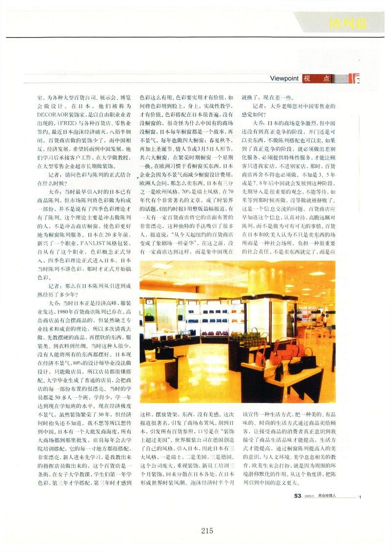 大喬:當時日本正是經濟高峰,服裝業發達,1980年百貨商店陳列已存在。高島商店雖有會擺商品的,但顯然缺乏專業技術和成套的理論,所以多次請我去做,先教擺硬的商品,再擺軟的東西,服裝類、到衣料到絲綢。當時這種人很少,沒有人能將所有的東西都擺好。日本現在經濟不景氣,80%的設計師畢業沒法做設計,只能做店員,所以店員都很懂搭配。大學畢業生成了普通的店員,會把商店的每一部分布置的很漂亮。當時的學員都是50多人一個班,學得少,學一年達到現在學短班的水平。現在經濟極度不景氣,雖然裝飾繁榮了30年,但經濟何時抬頭還不知道,我不想等所以想傳到中國。日本有一個大批發商海度,所有大商場都到那里批發,店員每年會去學院培訓搭配,它的每一寸地方都很搭配,非常漂亮,新人進來先學習,是我教出來的指揮店員做出來的,這個百貨店是一條街,在女子大學教課,學生們第一年學色彩,第三年才學搭配,第三年時才感到色彩這么有用。色彩要實用才有價值,如何將色彩用到臉上,身上,實戰性教學,才有價值。色彩搭配在日本很普遍,沒有沒櫥窗的,很奇怪為什么中國有的商場沒櫥窗,日本每年櫥窗都是一個故事,再不景氣,每年也做四大櫥窗:春夏秋冬,再加上圣誕節、情人節或3月5日人形節,共六大櫥窗,在繁榮時期櫥窗一個星期一換。在歐洲習慣于看櫥窗買東西,日本企業會因為不景氣而減少櫥窗設計費用,歐洲人會問,那怎么賣東西。日本有三分之一是歐洲風格,70%是瑞士風格。在70年代有個非常著名的文章,成了時裝界的話題,《紐約時報》用整版篇幅報道,有一天有一家百貨商店將它的店面布置的非常漂亮,這種獨特的手法吸引了很多人,報道說:“從今天起紐約的百貨商店變成了像劇場一樣豪華”,在這之前,沒有一家商店達到這樣,而是像中國現在這樣,擺放貨架,東西,沒有美感。這次報道很著名,引發了商場布置風。刮到日本,引發所有百貨參照,口號是在“裝飾上超過美國”。世界服裝公司在德國創造了自己的風格,引入日本,因此日本有三大風格,一是瑞士,二是美國,三是德國。這個公司龐大,重視裝飾,新員工培訓三個月裝飾,回來分散在日本各處,在日本形成世界時裝風潮。泡沫經濟時半個月就換了,現在差一些。