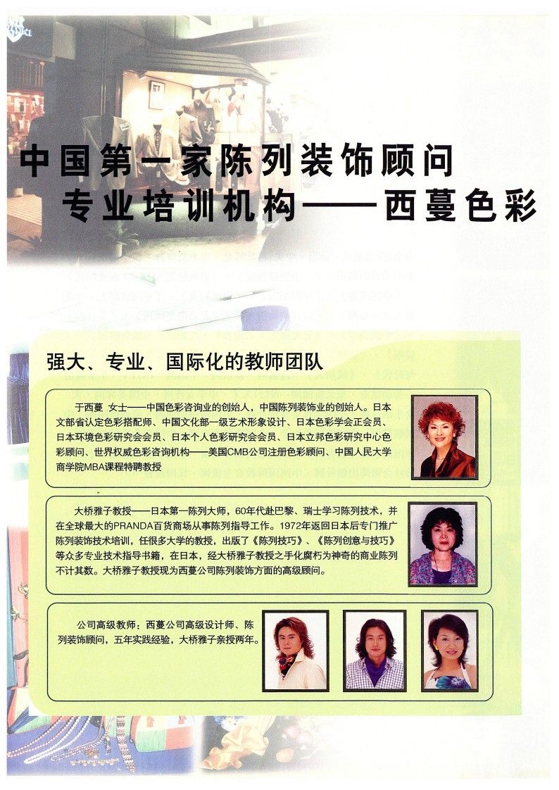 為此,北京西蔓色彩文化發(fā)展有限公司專程從日本引進(jìn)“陳列搭配師”這一職業(yè),決定在中國推廣。作為中國首家的色彩咨詢公司,當(dāng)時(shí)的西蔓也是將“色彩四季理論”這一新概念導(dǎo)入中國,并在短短的5年時(shí)間,色彩行業(yè)在中國就成如火如荼之勢(shì)。為使色彩更好地應(yīng)用到中國的各行各業(yè),西蔓女士敏銳地意識(shí)到櫥窗陳列設(shè)計(jì)與色彩的密切關(guān)系。因?yàn)樯适鞘袌?chǎng)陳列技術(shù)的一部分,要想沖擊消費(fèi)者的視覺,和諧的色彩能更好地為之服務(wù)。