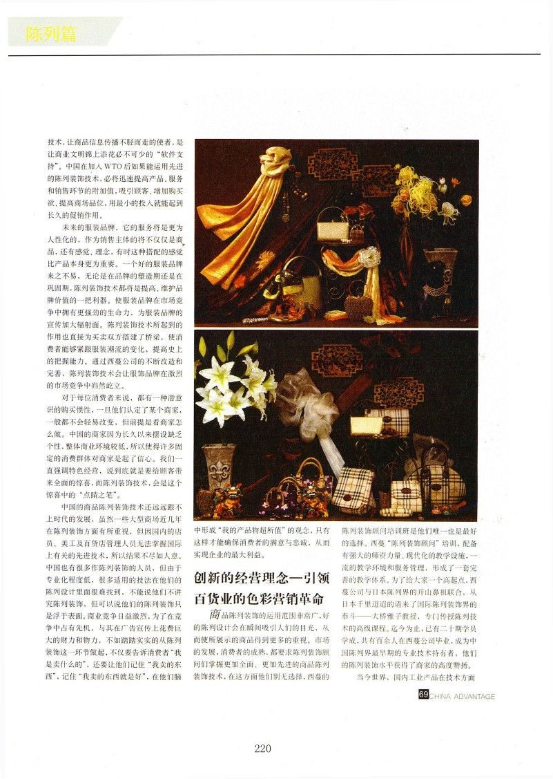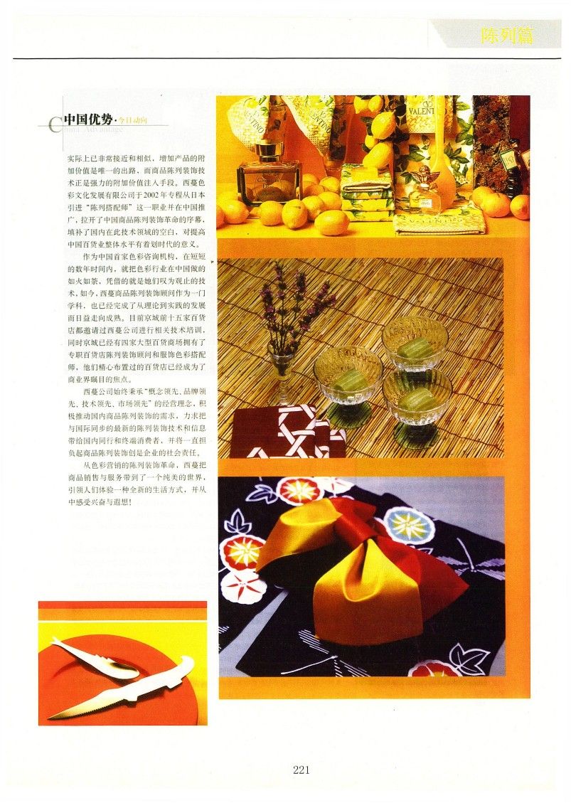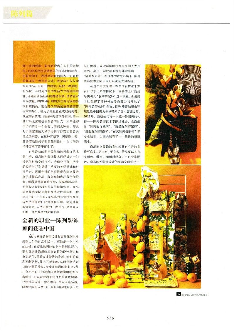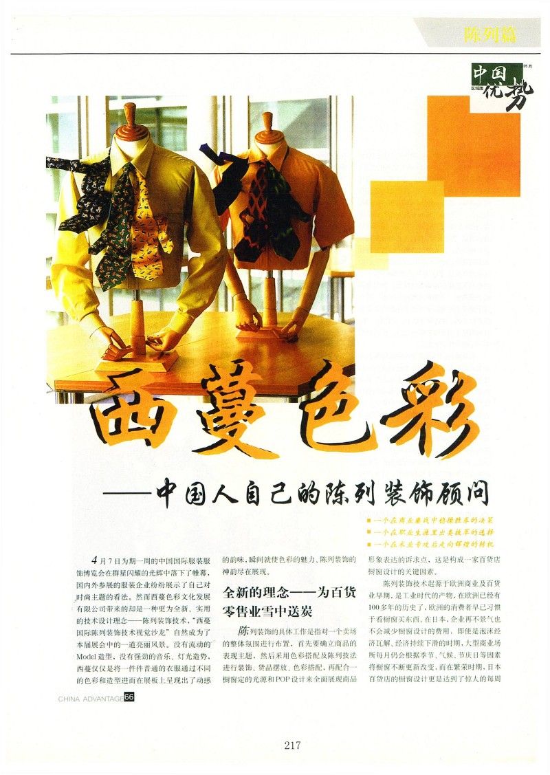 當今世界,國內工業(yè)產品在技術方面實際上已非常接近和相似,增加產品的附加價值是唯一的出路,而商品陳列裝飾技術正是強力的附加價值注入手段。西蔓色彩文化發(fā)展有限公司于2002年專程從日本引進“陳列搭配師”這一職業(yè)并在中國推廣,拉開了中國商品陳列裝飾革命的序幕,填補了國內在此技術領域的空白,對提高中國百貨業(yè)整體水平有著劃時代的意義。