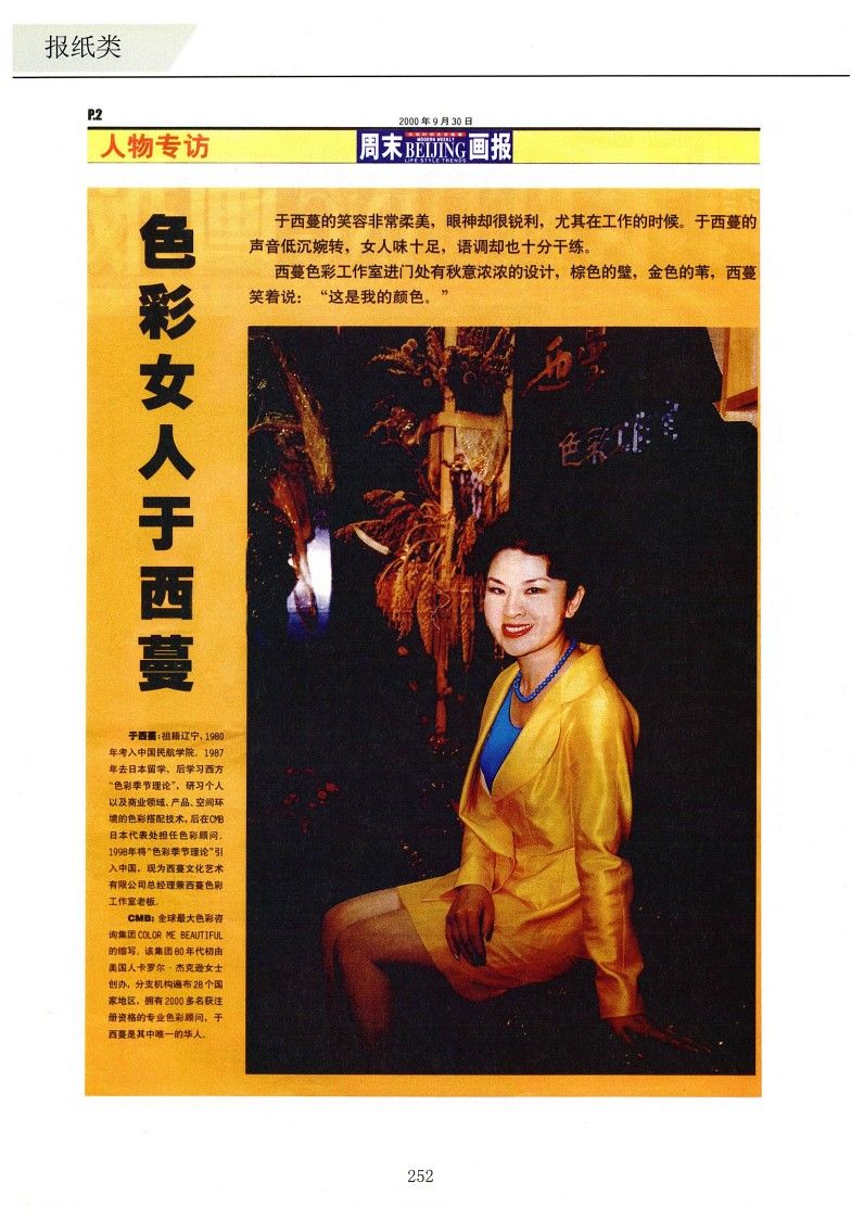 于西蔓:祖籍遼寧,1980年考入中國民航學院。1987年去日本留學,后學習西方“色彩季節理論”,研習個人以及商業領域、產品、空間環境的色彩搭配技術,后在CMB日本代表處擔任色彩顧問。1998年將“色彩季節理論”引入中國,現為西蔓文化藝術有限公司總經理兼西蔓色彩工作室老板。