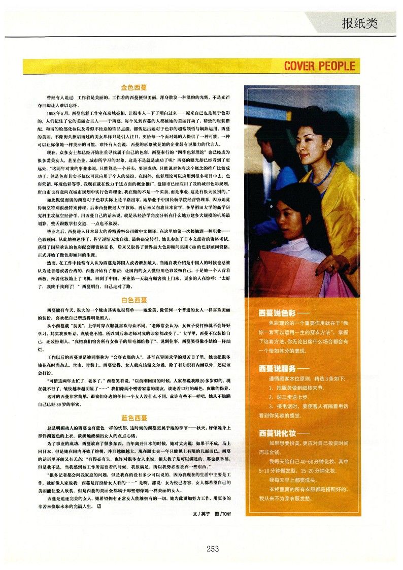 1998年5月,西蔓色彩工作室在京城亮相,讓很多人一下子明白過來——原來自己也是屬于色彩的,人們記住了它的美麗女主人——于西蔓。每個見到西蔓的人都被她的美麗打動了,精致的服裝搭配,和諧的臉部化妝以及看似不經意的飾品點綴,都傳達出她對于色彩的超常領悟與嫻熟運用。西蔓的美麗,不像街頭擦肩而過的美女那樣只是引人注目,更給每一個面對她的人提供了一種可能,一種可以讓你像她一樣美麗的可能。難怪有人會說:西蔓的形象就是她的企業最有說服力的代言人。