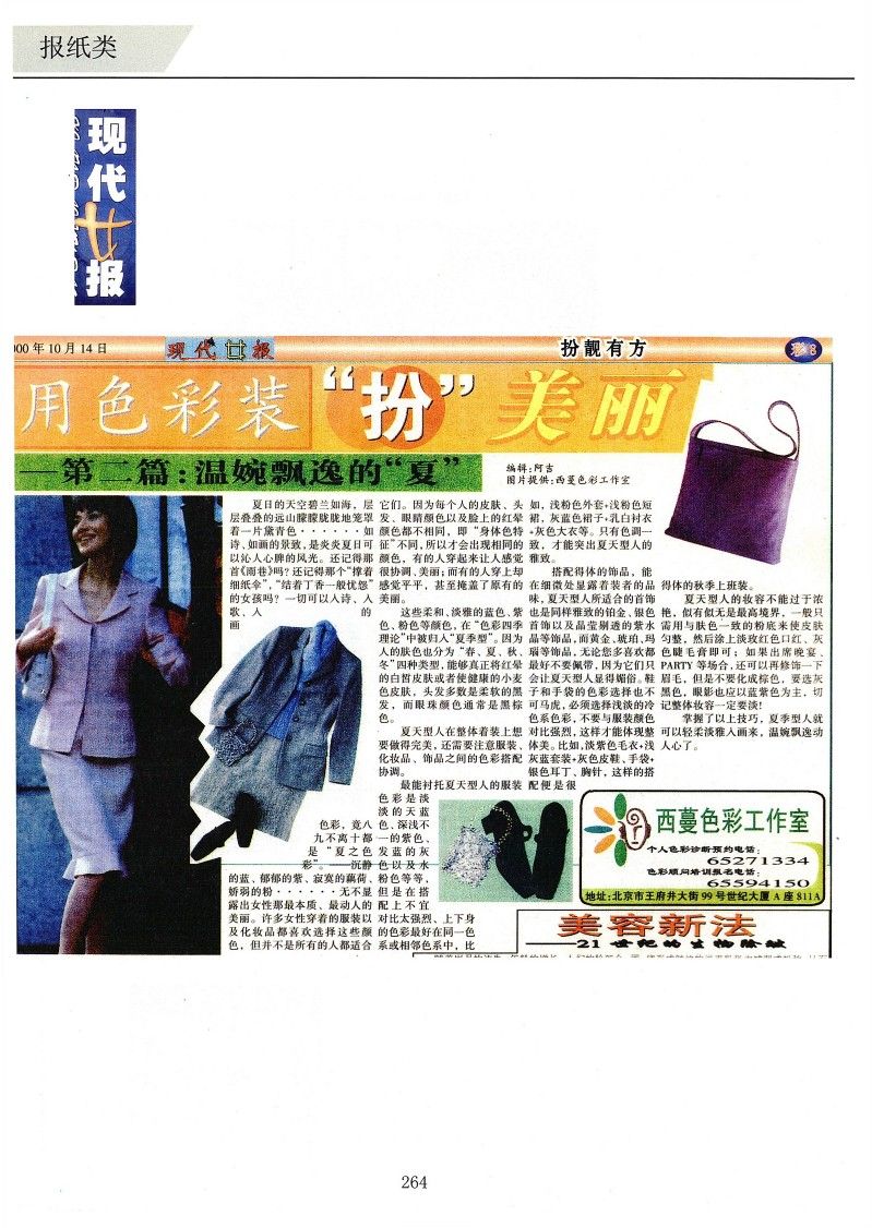 夏日的天空碧藍如海,層層疊疊的遠山朦朦朧朧地籠罩著一片黛青色……如詩、如畫的景致,是炎炎夏日可以沁人心脾的風(fēng)光。還記得那首《雨巷》嗎?還記得那個“撐著細紙傘”,“結(jié)著丁香一般憂怨”的女孩嗎?一切可以入詩、入歌、入畫的色彩,竟八九不離十都是“夏之色彩”。——沉靜的藍、郁郁的紫、寂寞的藕荷、嬌弱的粉……無不顯露出女性那最本質(zhì)、最動人的美麗。許多女性穿著的服裝以及化妝品都喜歡選擇這些顏色,但并不是所有的人都適合它們。因為每個人的皮膚、頭發(fā)、眼睛顏色以及臉上的紅暈顏色都不相同,即“身體色特征”不同,所以才會出現(xiàn)相同的顏色,有的人穿起來讓人感覺很協(xié)調(diào)、美麗;而有的人穿上卻感覺平平,甚至掩蓋了原有的美麗。