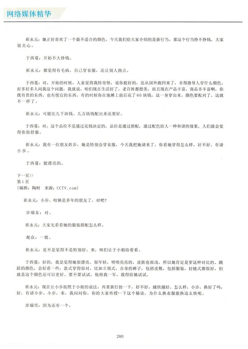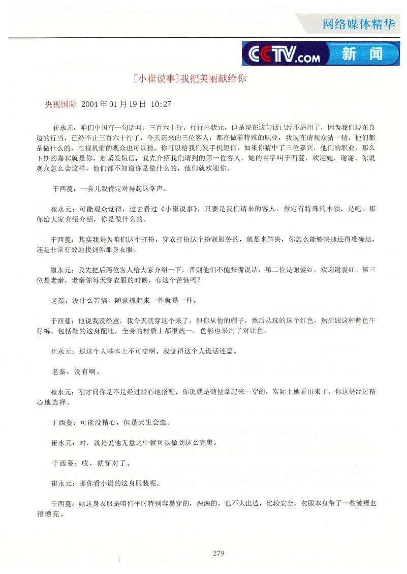 崔永元:現在讓小步按照于小姐的說法,再重新打扮一下,好不好,越快越好。怎么樣,小步,換好了嗎,好,有請小步。小步,來,我問問你,你給大家傳授一下這個秘訣,為什么換衣服能換這么快呢。