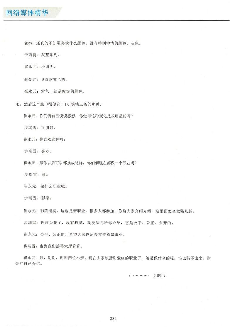 崔永元:咱們中國有一句話叫,三百六十行,行行出狀元,但是現在這句話已經不適用了,因為我們現在身邊的行當,已經不止三百六十行了,今天請來的三位客人,都在做著特殊的職業,我現在請觀眾猜一猜,他們都是做什么的,電視機前的觀眾也可以猜,你可以給我們發手機短信,如果你猜中了三位嘉賓,他們的職業,那么下期的嘉賓就是你,趕緊發短信,我先介紹我們請到的第一位客人,她的名字叫于西蔓,歡迎她,謝謝。你說觀眾怎么會這樣,他們都不知道你是做什么的,他們就歡迎你。